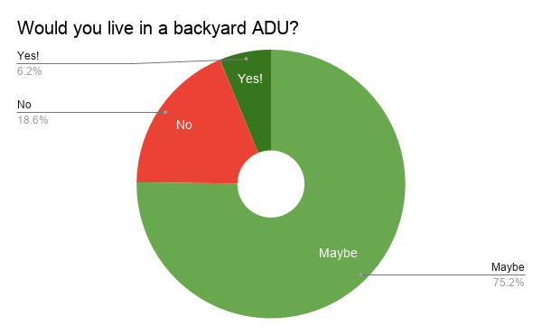 December 2019–Feb 2020 Created a survey to gauge how people felt about alternative housing types (backyard ADUs, tiny houses, bungalows). 129 respondents.